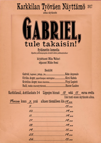 Näytelmän ohjaa Mikko Semi ja Gabrielin roolissa nähdään Keke Asposalo. Angerin paperikaupan sisaruksia, Kristiinaa ja Ulriikkaa, esittävät Virpi Lepistö ja Kirsi Kahela, ja nuoren Railin roolissa nähdään Hanne Laakso.