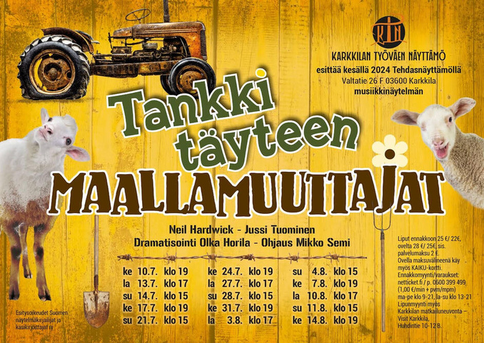 Tankki täyteen - maallamuuttajat on jatkoa viime syksynä Karkkilassa suuren suosion saaneelle Tankki täyteen - näytelmälle ja niin maan perusteellisen hauska näytelmä onkin!